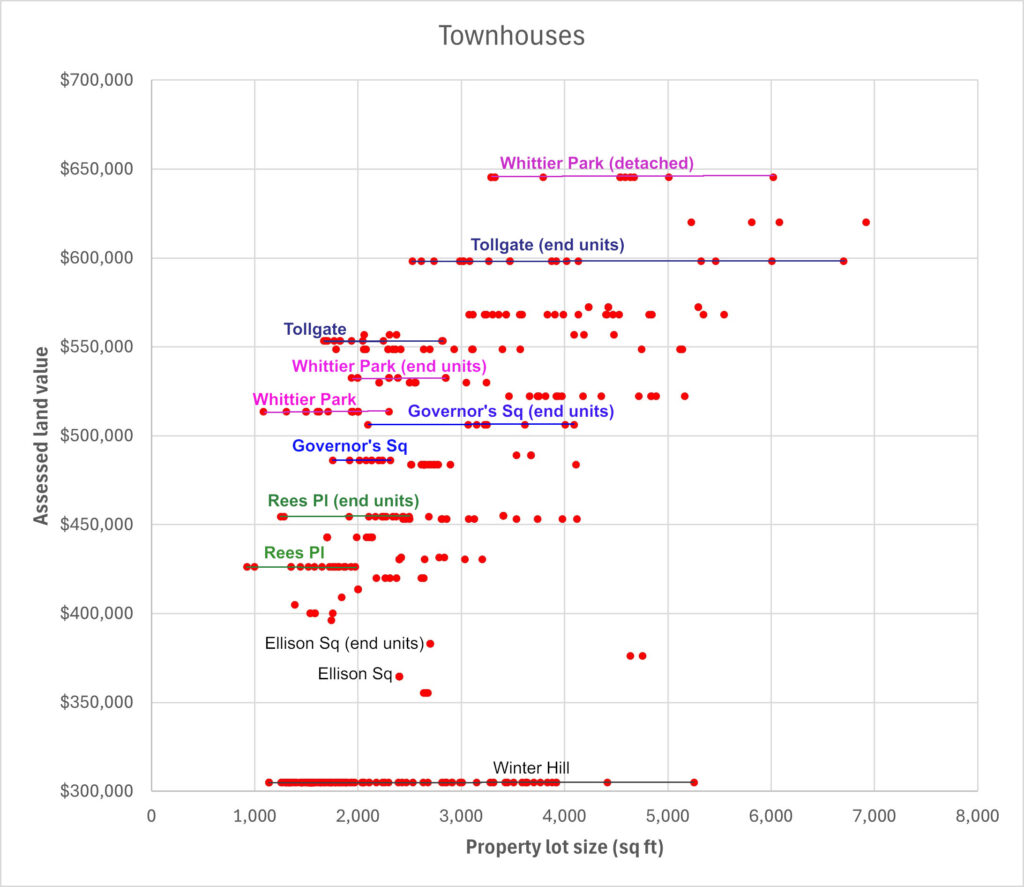 Since individual townhome lot assessed values seem to be independent of the lots’ sizes, we theorized that the total assessed land value of each complex must have been calculated first, then apportioned to its units.