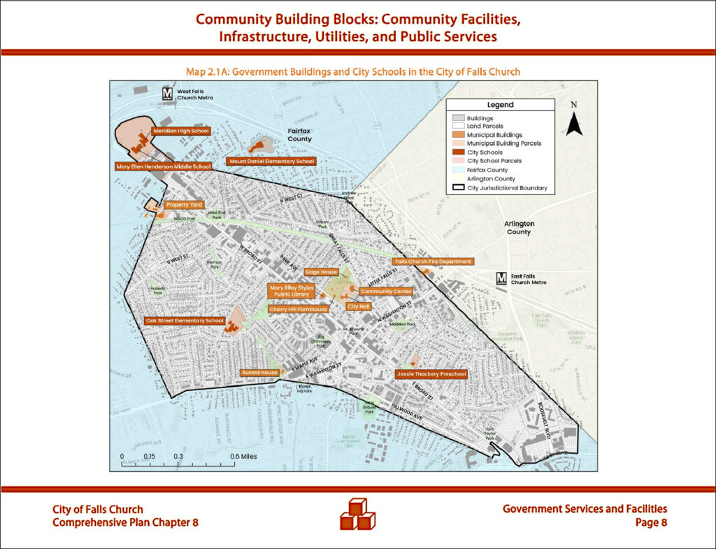 Each section includes an overview of the existing facilities, utilities, and/or services; an evaluation of the needs in each area; and preliminary recommendations. The City’s future needs are summarized by the Falls Church Pulse in the accordion table below.