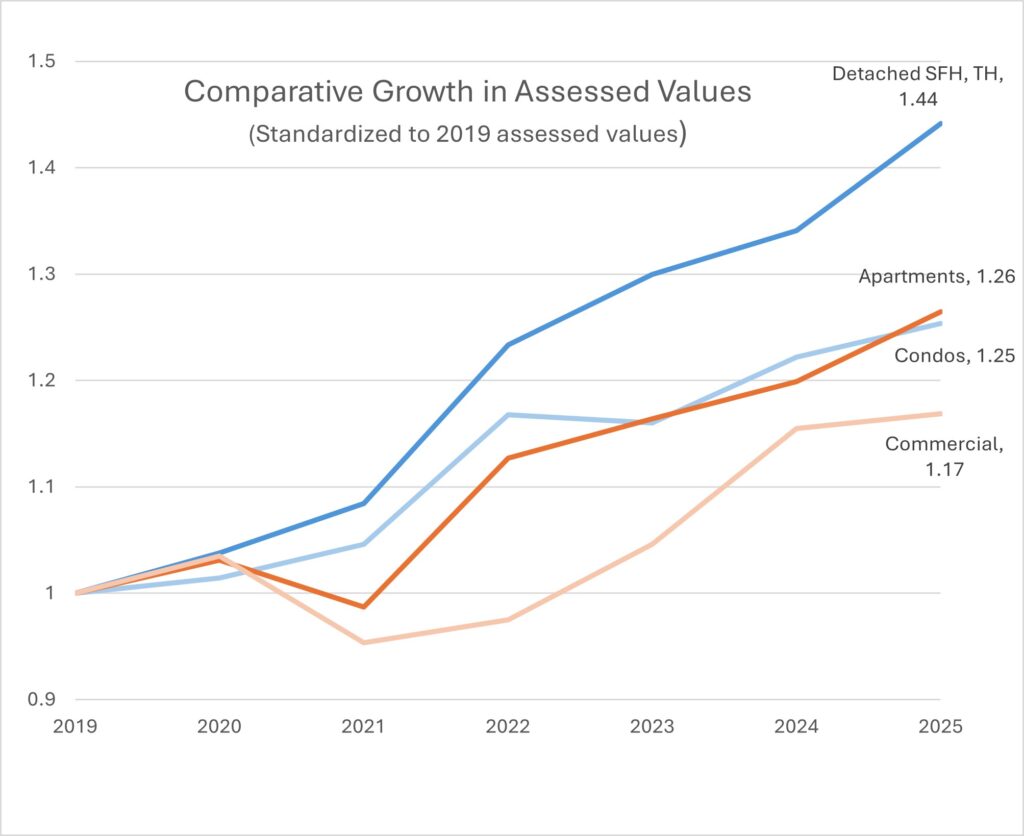 The new developments increased the tax base of apartments as expected, from $200 million in 2013 to $900 million in 2025. However, the surge in the housing market for single-family homes caused the valuation of SFH properties to rise much faster than other types of housing so that its share of the tax base was only slightly reduced.