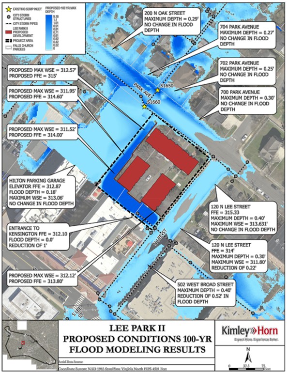 Madison Homes Vice President Andrew Rosenberger explained to the Planning Commission that the Lee Park II site has an “overland relief issue.” He said there is a stormwater inlet on Park Avenue near the Hilton Gardens garage that is undercapacity despite its large size. In an extreme storm event, that inlet is known to have overflowed so that stormwater flows through the garage and onto the Lee Park II site making its way to N Lee Street and down to Broad Street.