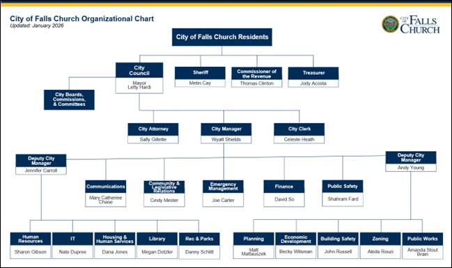 - The day after presenting the General Government’s proposed budget for Fiscal Year 2027 on March 23, 2026, City Manager Wyatt Shields announced plans to retire after 23 years of service, initially as Assistant City Manager and from January 2007 in his current role. In a City press release, he called his time in Falls Church “the honor of my life” and expressed gratitude “for the trust that has been given to me by this community.”